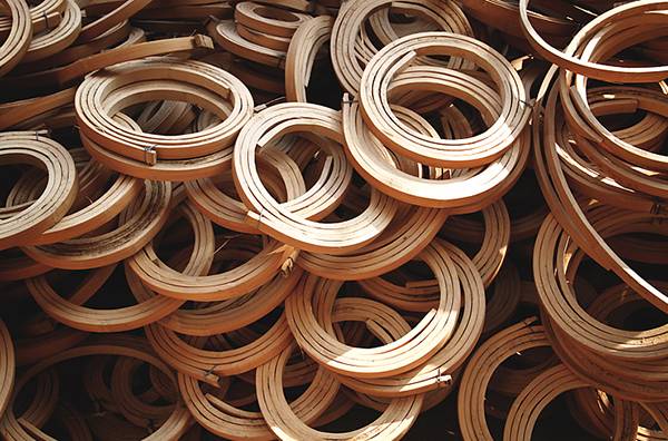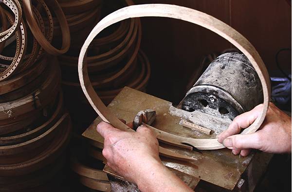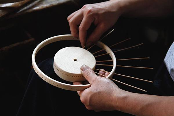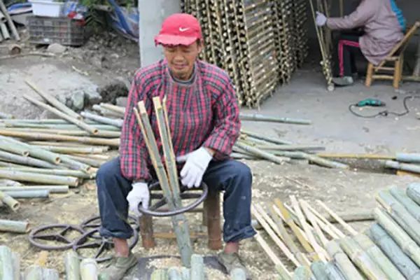外围的竹圈首先要将竹条受热弯曲成型,大概三十秒之后使竹条冷却,就形成了圆润的竹圈;这些竹圈都是手工制作完成的,而要达到这个水平,手工艺人至少要有五年的工作经验。竹圈形成后,再在竹圈上打孔,插入提前制作完成的细竹丝,细心编制完成。