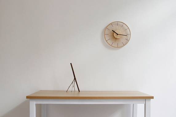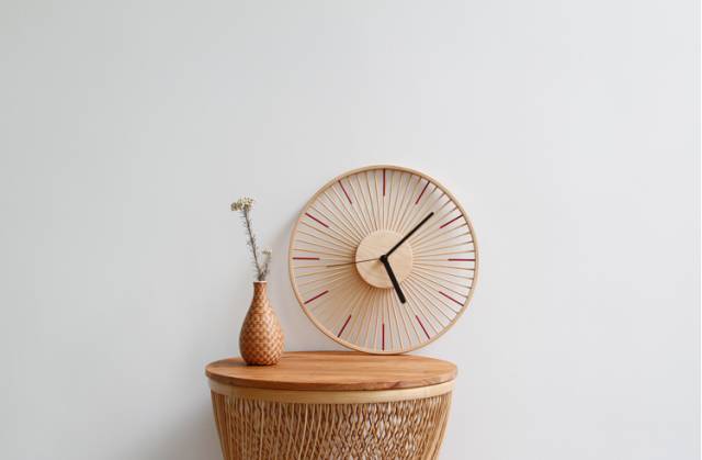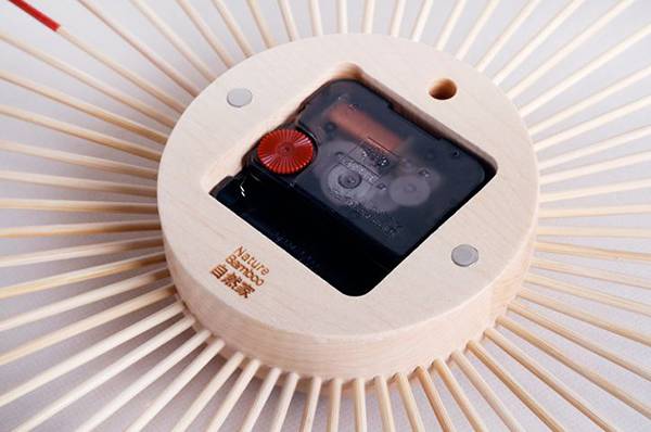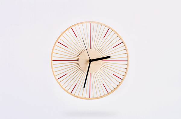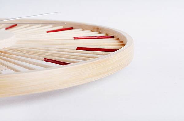 就是这款竹丝挂钟,它的材质是楠竹丝,直径为 33 公分。整个时钟上没有任何数字显示,只是用 12 根手工浸色的红竹丝代表时刻;整体看起来简单、轻巧,又很有设计感,完全不是传统时钟给人的感觉。