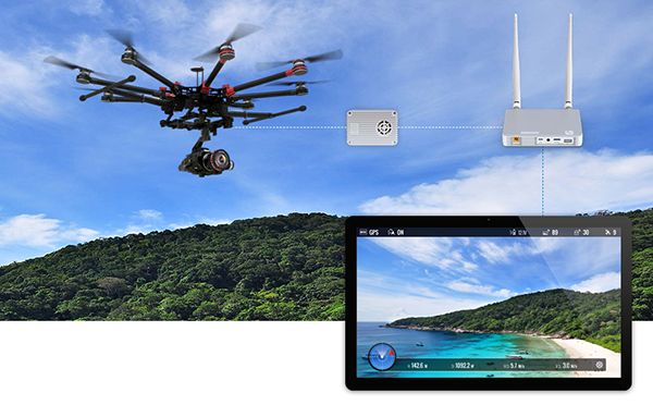 无人机镜头拍摄的画面可以实时无线传输到地面的显示屏上,无人机的图传系统体积小、距离远、清晰度高。这样的设备在地面的机器人、单兵指挥系统上同样有用。