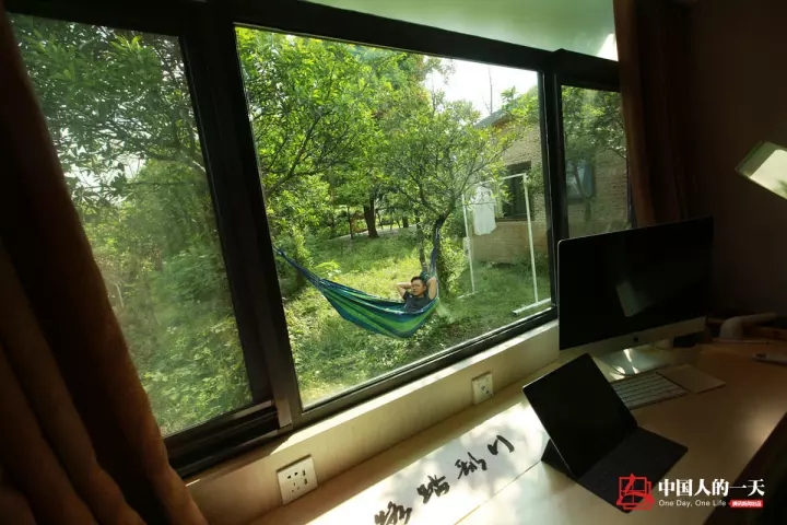 闲来无事时,阮晨海在窗外的吊床上小憩。说起居住感受,他表示很满意。“你看,很通透,又很私密,功能齐全,网速还挺快呢。”他的孩子认为爸爸这套房子“超酷”。“开始的时候他很担心,觉得我住在荒郊野外,一个人很孤单。后来视频给他看了以后,他觉得,哇,超酷。”
