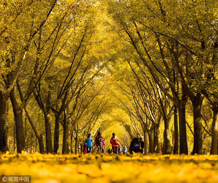 北京张各庄,这里有着80多万株银杏,是京城最大的银杏树种植基地。与古银杏不同,这里的银杏树树龄较短,并且不会长得很高,所以显得枝叶更加繁茂。放眼望去,一片连绵不断的金黄,美得没有尽头。
