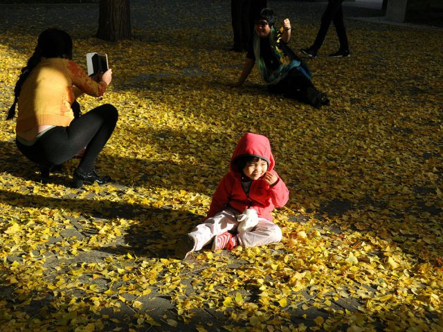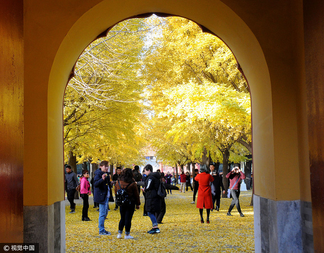 11月7日,北京天气晴好, 中山公园银杏大道秋色浓郁,黄灿灿的银杏树与满地的银杏叶交相辉映、美景醉人,吸引许多市民游人观赏拍照。