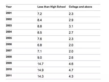 图一是美国社会收入和最高学历的关系,图二是美国社会失业率和受教育程度的关系,数据来自SAUS和BLS。