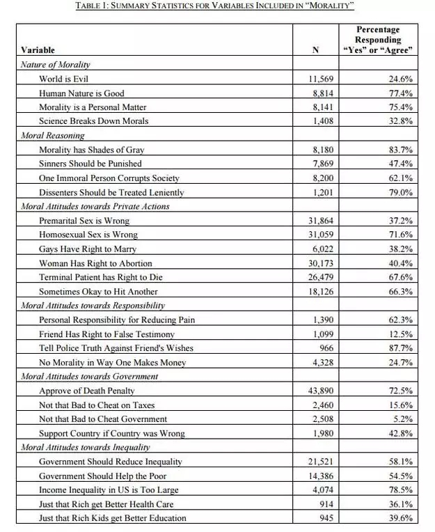Richard设置了很大的样本数据,对受访者询问了一系列用以衡量道德的数据。包括对道德理念的认知、道德逻辑、个人行为、责任观点、对政府态度与对不平等现象认知等,涉及问题如下: