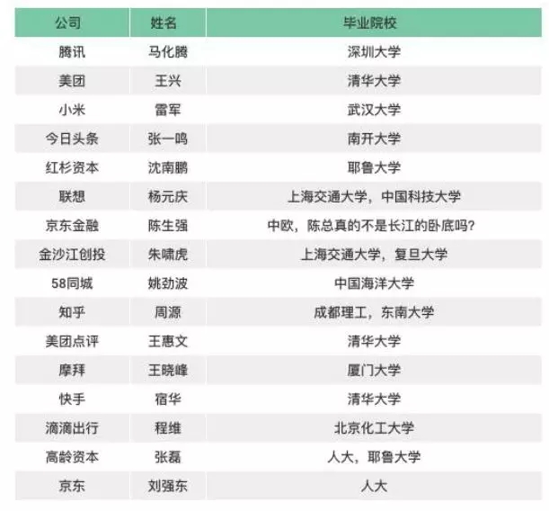 不单如此,京东的刘强东是宿迁高考状元,美团的王兴是保送进的清华,小米的雷军2年修完4年本科学分。还有不在饭桌上的百度李彦宏(北大)、巨人史玉柱(浙大)也都是高考状元。