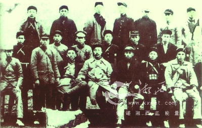 红六军团在长征中攻占湘中新化县城后部分干部合影。前排左三为王震,左五为萧克。