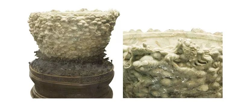 俗称“福海”。玉山原料来自新疆和阗,由扬州玉工经四年时间精心雕琢,于清乾隆四十五年(1780年)十月完成。瓮雕九龙,底镌乾隆皇帝书《玉瓮记》。瓮下配海水纹铜座。象征“福如东海长流水”。