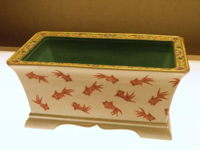 花盆长方形,外壁四面白地轧道,以粉彩绘金鱼图,画面生动活泼,设色妍丽悦目。