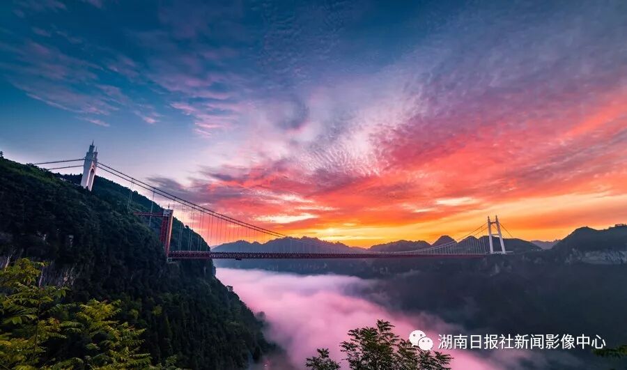 吉首市矮寨大桥,朝霞映红了云海。