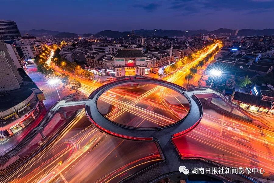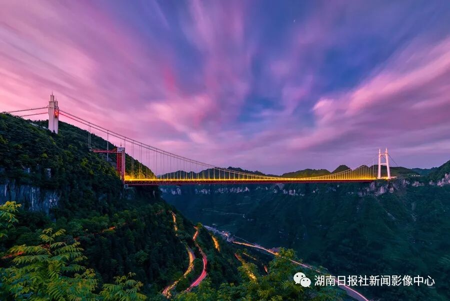 傍晚,吉首市矮寨大桥,灯光灿烂,桥下国道上车轨如流。