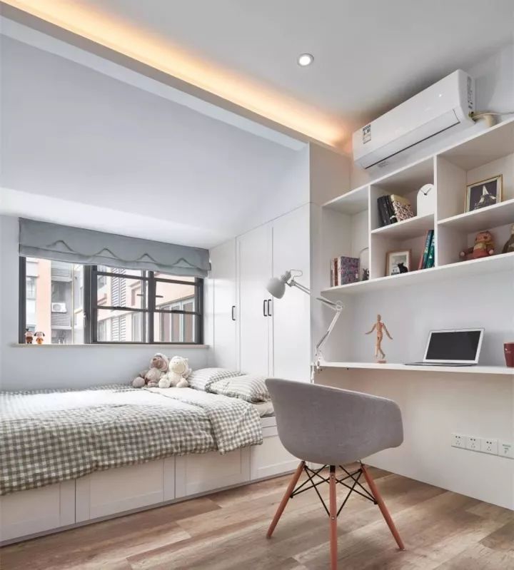 一个超级实用的榻榻米空间,可以结合靠墙而立的定制柜体,来提高整个房间的收纳机能,达到“一房多用”的目的。