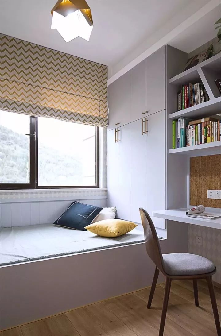 靠窗安装L型榻榻米组合柜的布局方式,可以在不影响采光的前提下,更好地完成衣物、书籍和零碎物品的收纳,还能提高整体空间的利用率,塑造简洁干净的空间感。