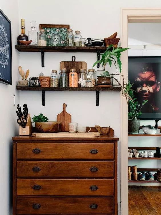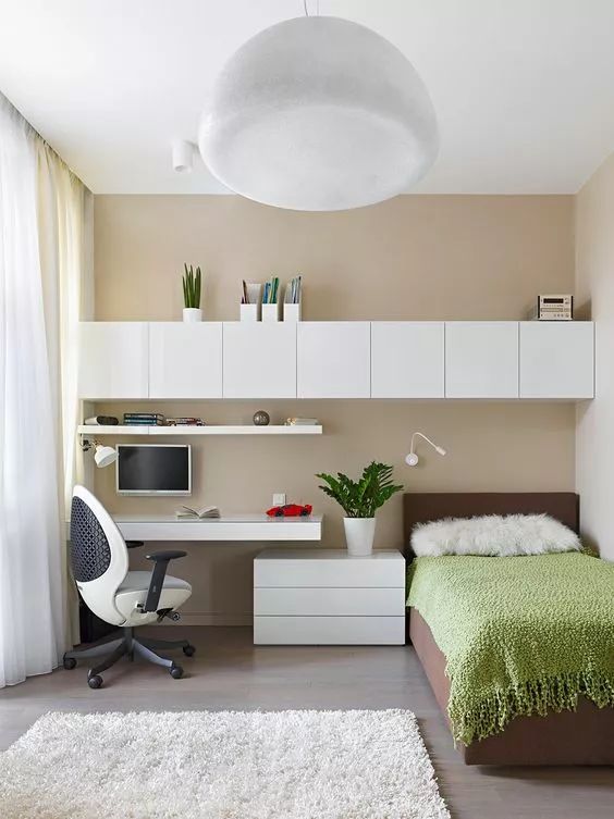 小户型想扩容收纳,可以在角落墙面装置物搁板,或是在书桌或储物矮柜上安装吊柜,提升房子的纵向收纳能力。