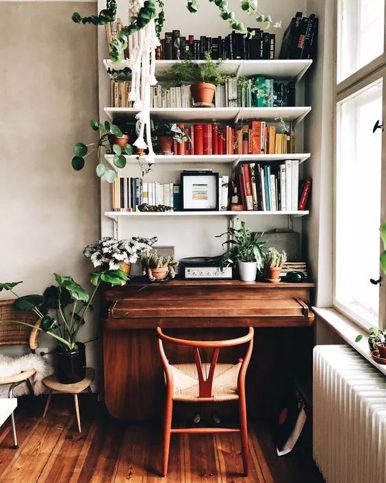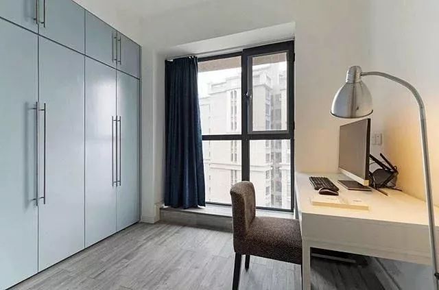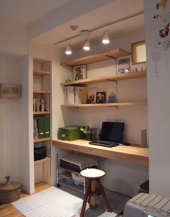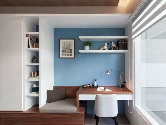 在角落墙面、书桌上方安装多层置物板,不影响人室内活动的同时,提高了房子的收纳能力,实用!