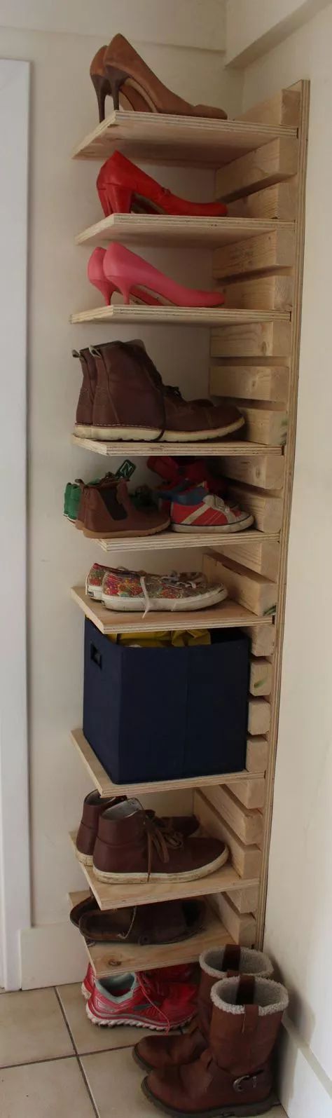 小户型没有独立玄关,没法装大鞋柜,可以像这样在墙上装一排搁板,将日常常穿的鞋放上去,看着整齐又方便拿取。