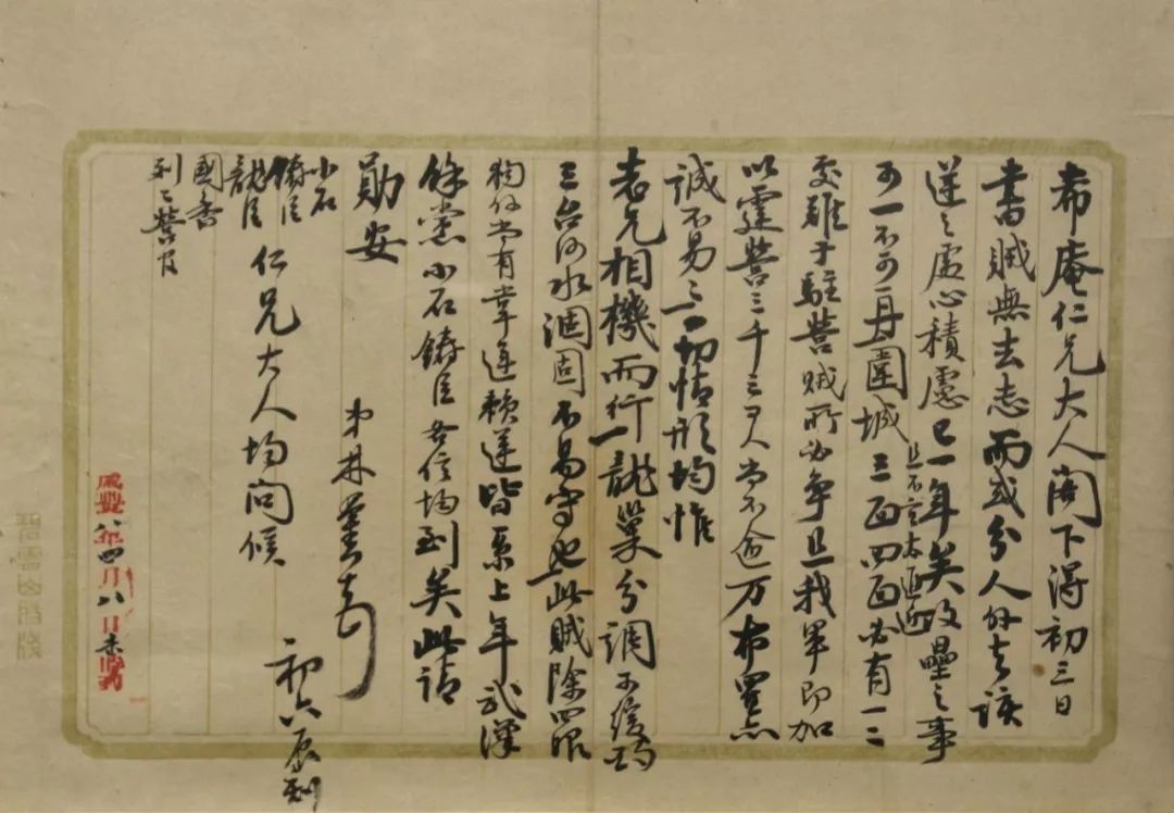 咸丰七年八月初九日,信札中提及:“瑞州之失固在目前矣”,时去刘腾鸿攻取瑞州阵亡未及月半,“弟至今尚深惜壮士之不再得矣”。