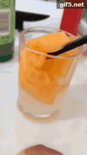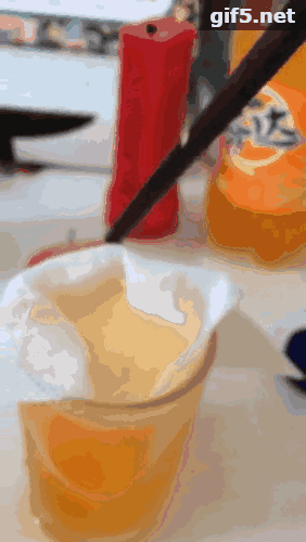 1分钟后,杯子里的饮料呈现出白色状,而色母片已变成橘色。