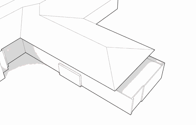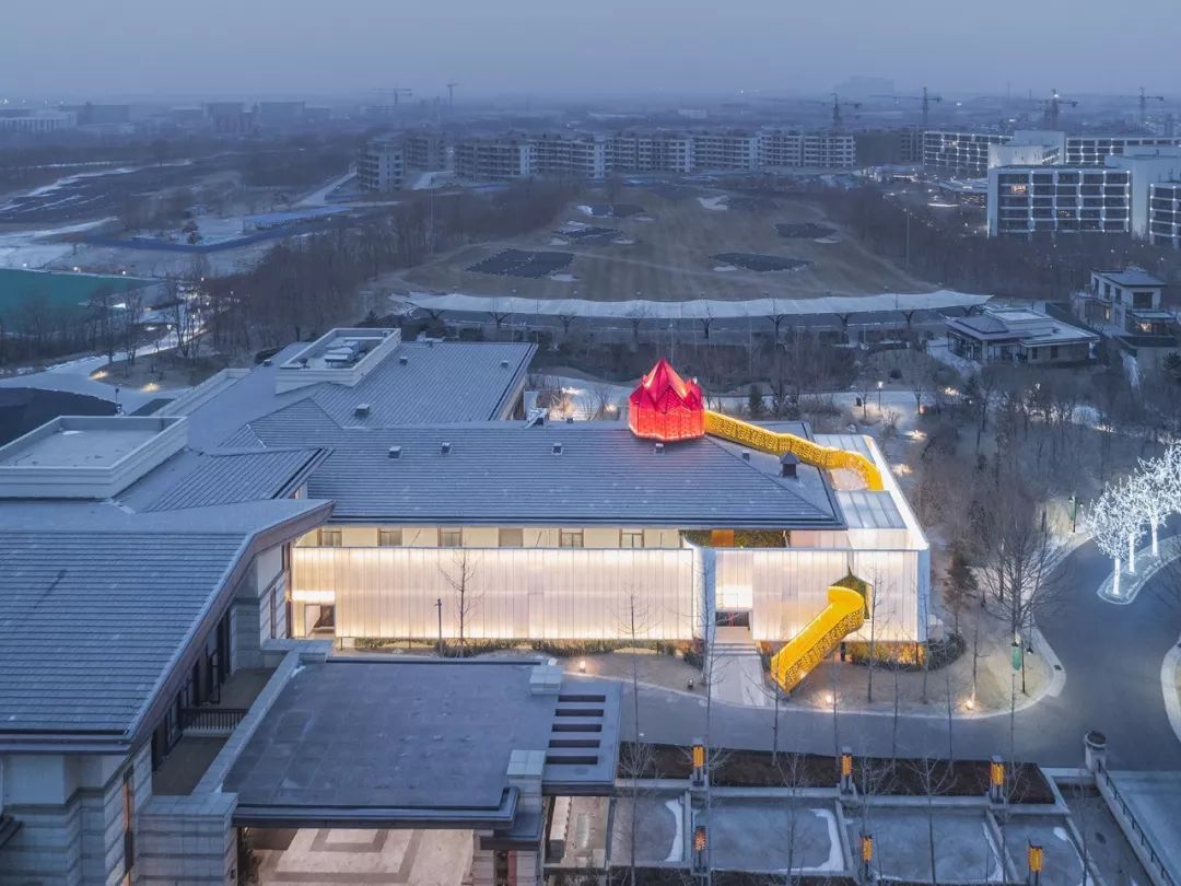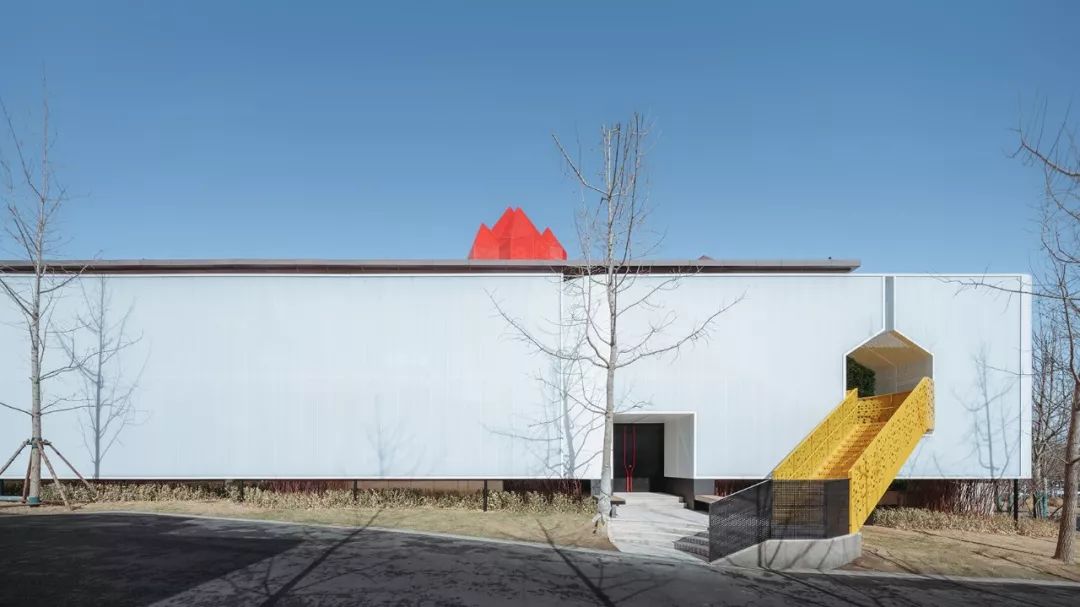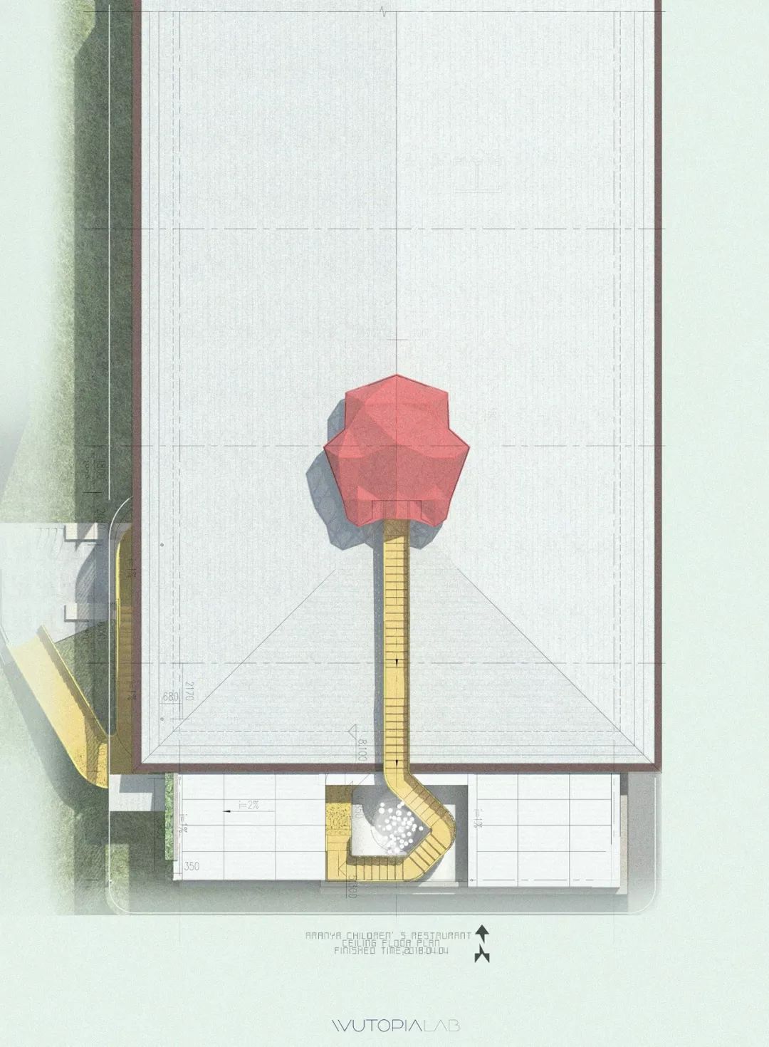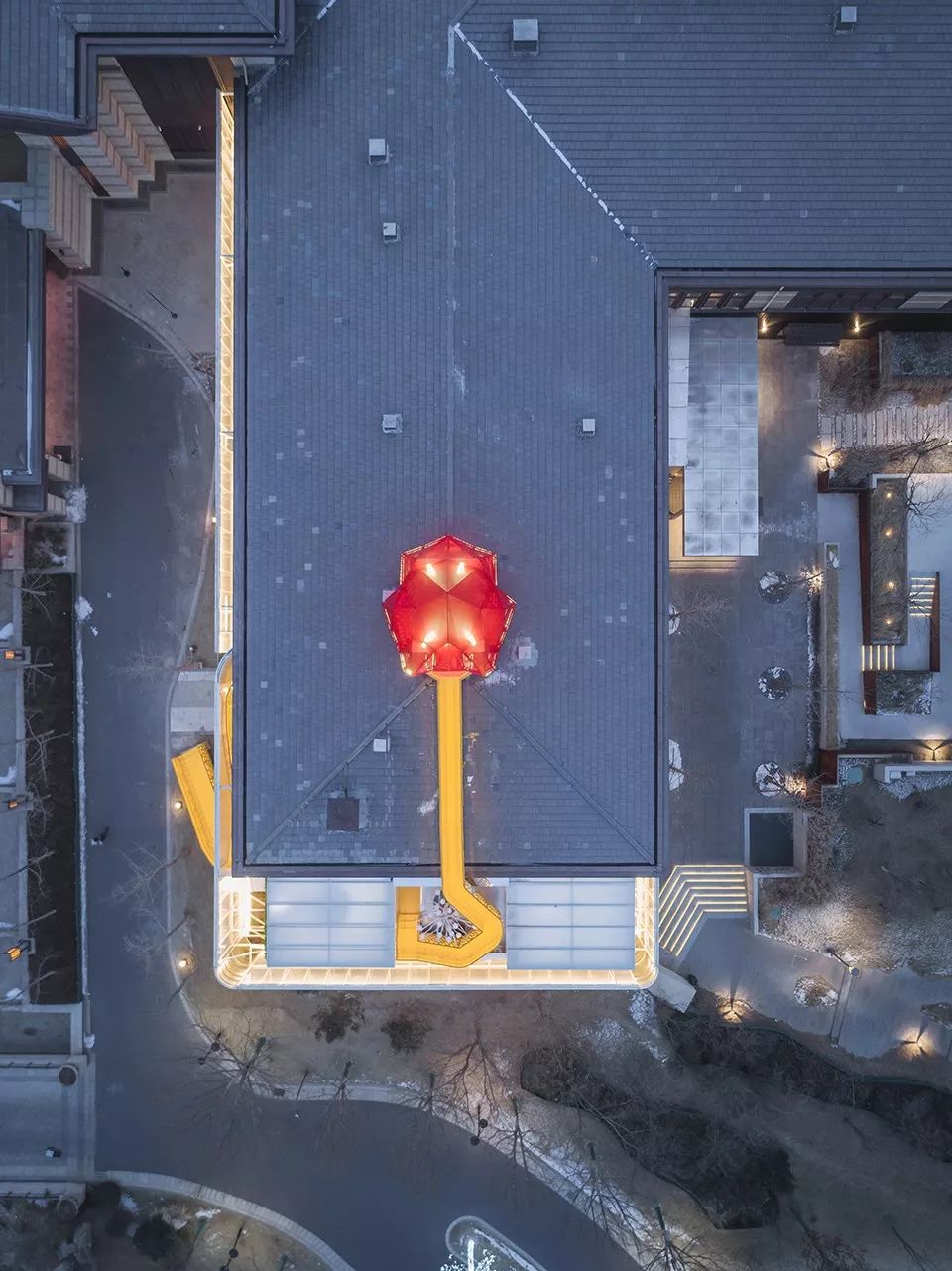 整个餐厅最重要的高潮是屋顶上用双层穿孔铝板建造的红色飞屋。沿着黄色的线索,经过一个不锈钢的水面,绕过泡泡树,曲折走向屋脊,光线越来越亮。这空中的飞屋很容易成为园区一个显而易见的标志,它也可以是灯塔,指出我们生活的局限。