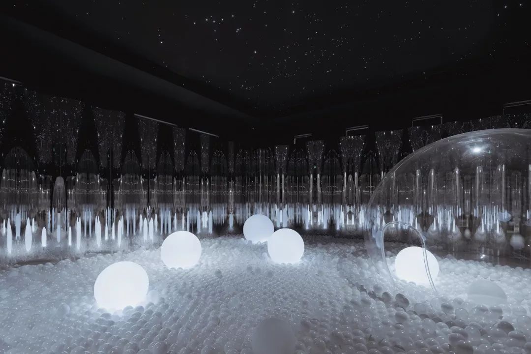 沿着弧形大楼梯进入一层的星空下的梦境。在星空天花下,我们用PVC空心球,玻璃纤维布,海洋塑料球,人造石和地胶为孩子们打造了一个游乐场。以哈哈镜作为游戏空间的边界,扭曲的镜面也扭曲了场所的真实感,仿佛时间不在流逝。