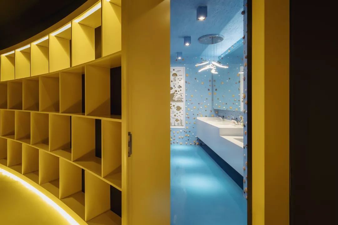 在主要空间的边缘,隐藏了粉色回忆卫生间,海洋之声卫生间,有镜池,不锈钢的滑梯,蹦床和泡泡树以及一个神秘的绘本区。它们是这个新世界的角落,需要孩子们自己去发现。