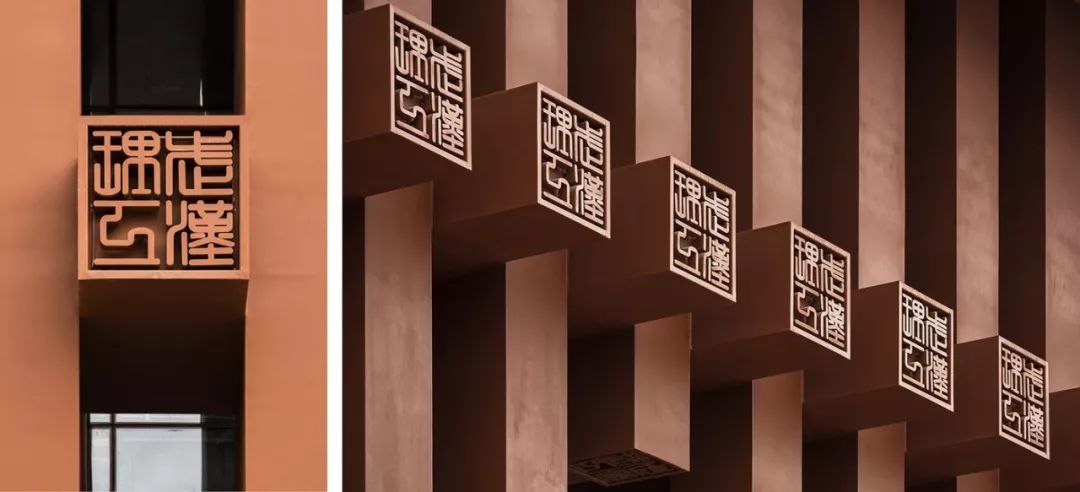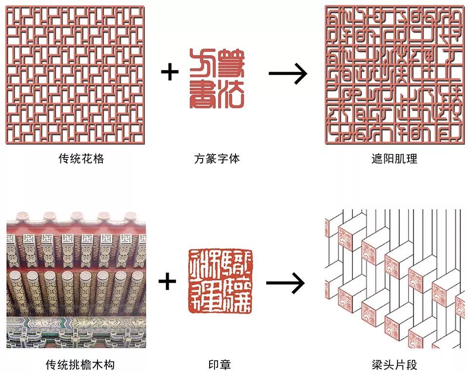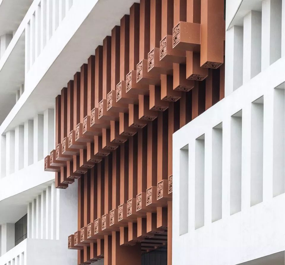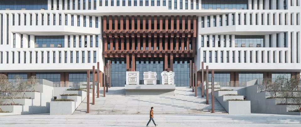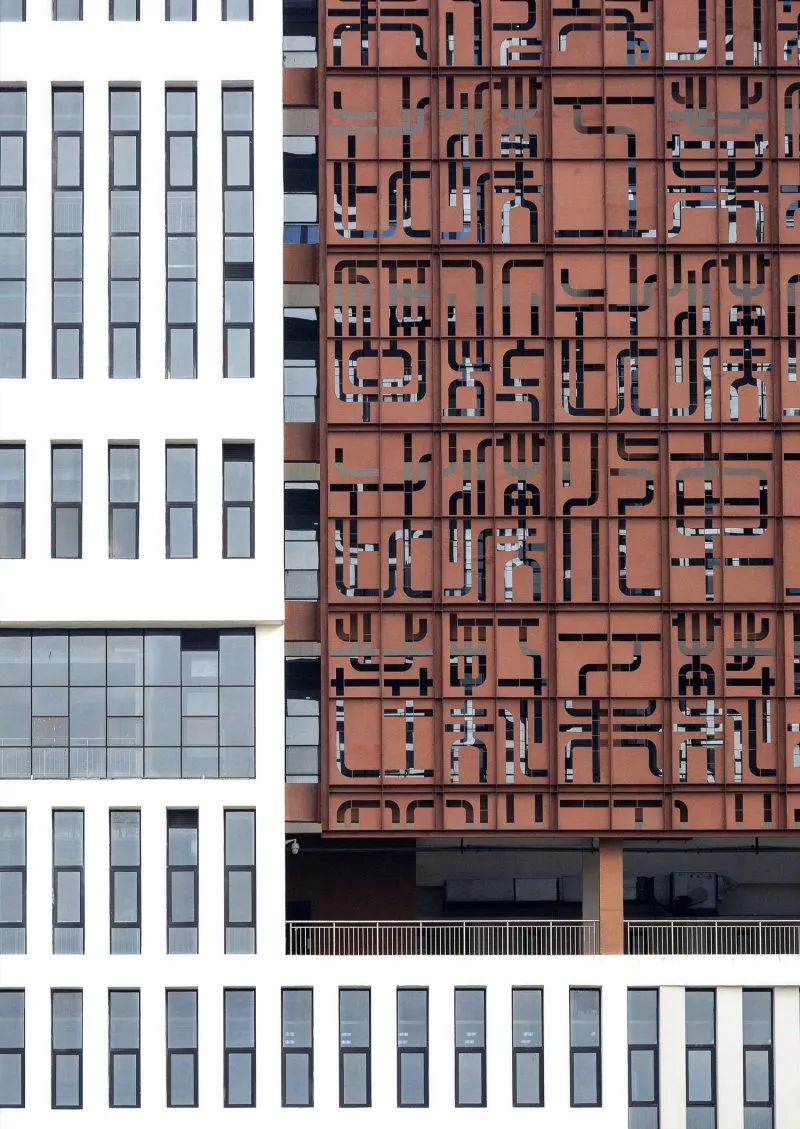 图书馆主入口通过对传统斗拱、排架的拆分和重组,以钢结构构架演绎传统木构的形态。东西立面覆以木色金属板,并将校园历史文化通过抽象篆书文字镂刻之上。将楚文化进行抽象和演绎,使历史底蕴在新建筑上得以延续和传承。