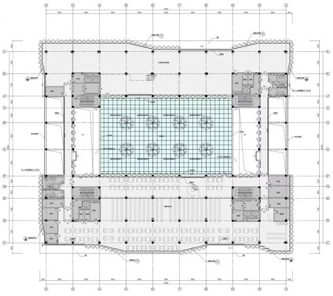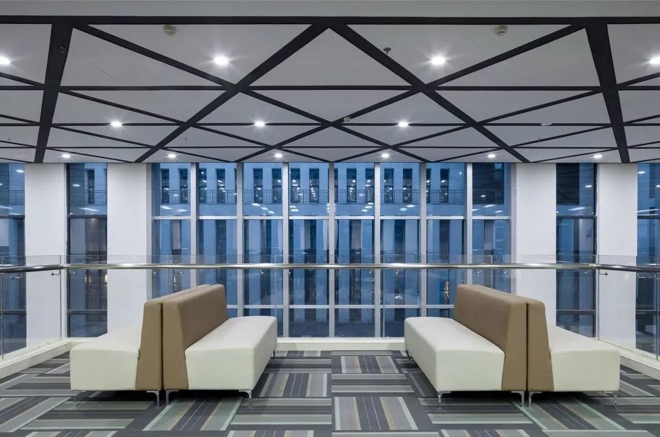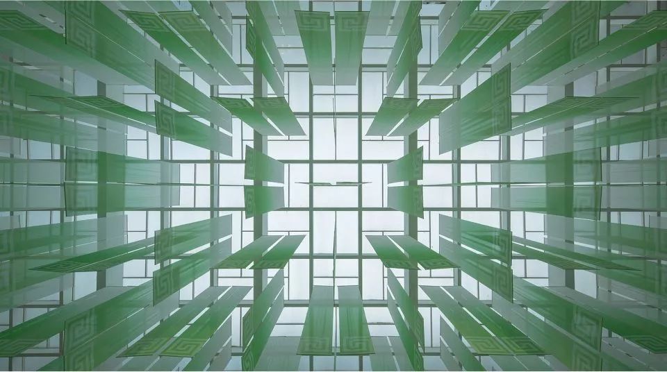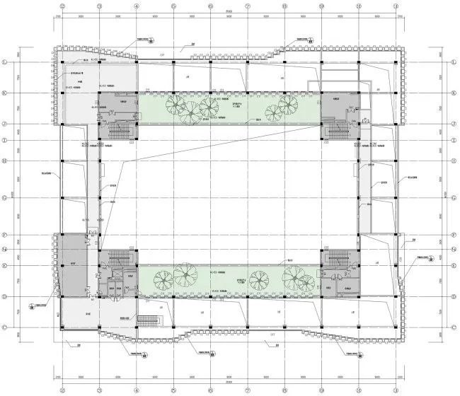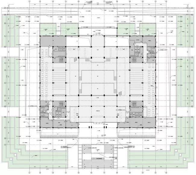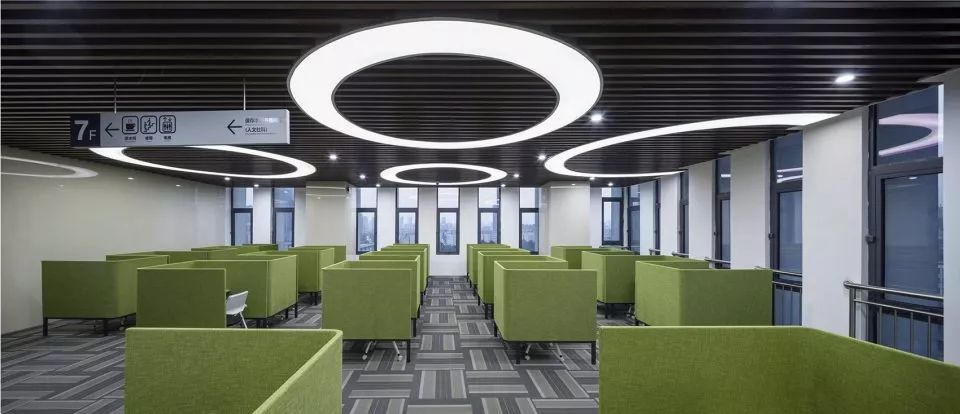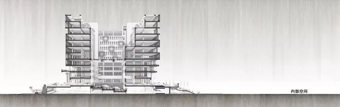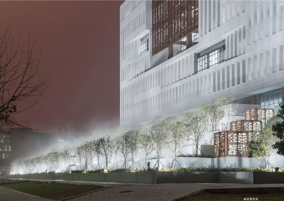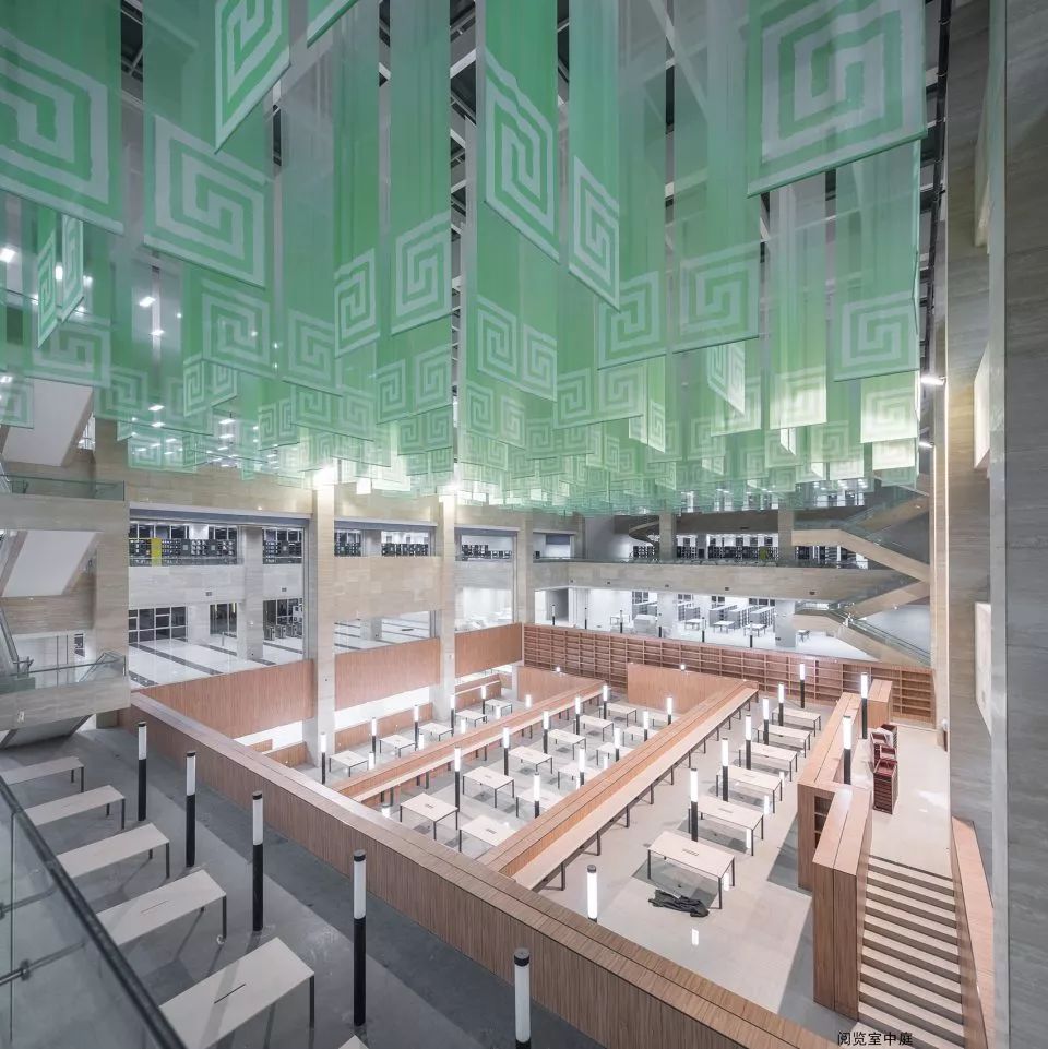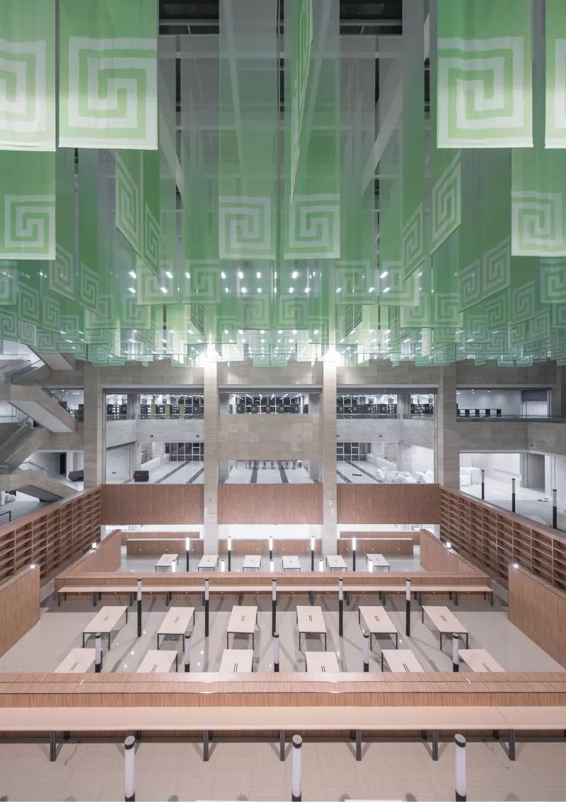 设计提取传统院落的精粹,以立体庭院的方式营造绿谷的意向。玻璃中庭悬挂绿色垂幔,形成对直射阳光的有效遮挡,也营造出绿意盎然的中庭效果。同时在首层基座跌台绿化设置雾喷,改善图书馆建筑的微气候。