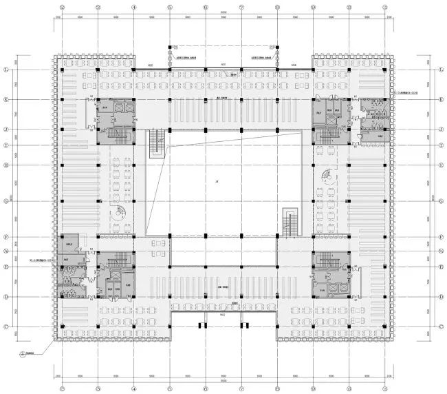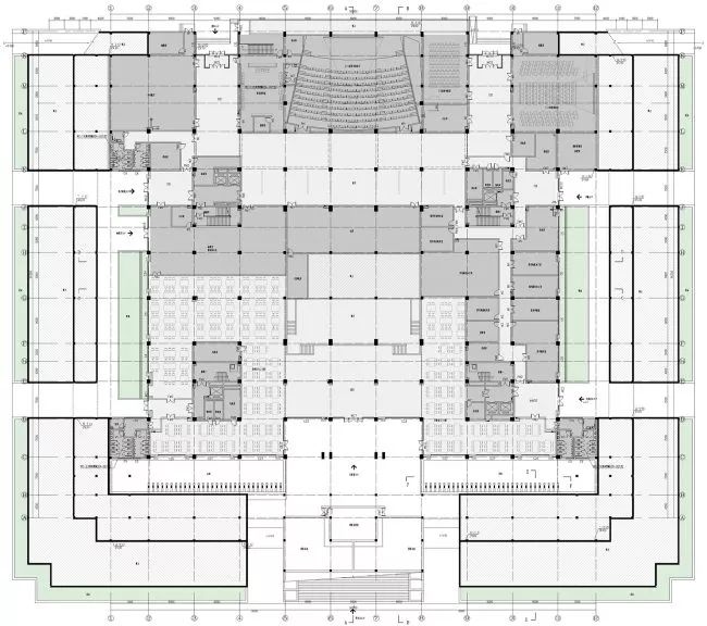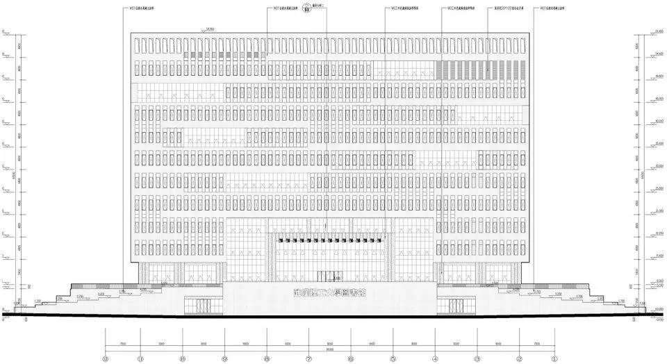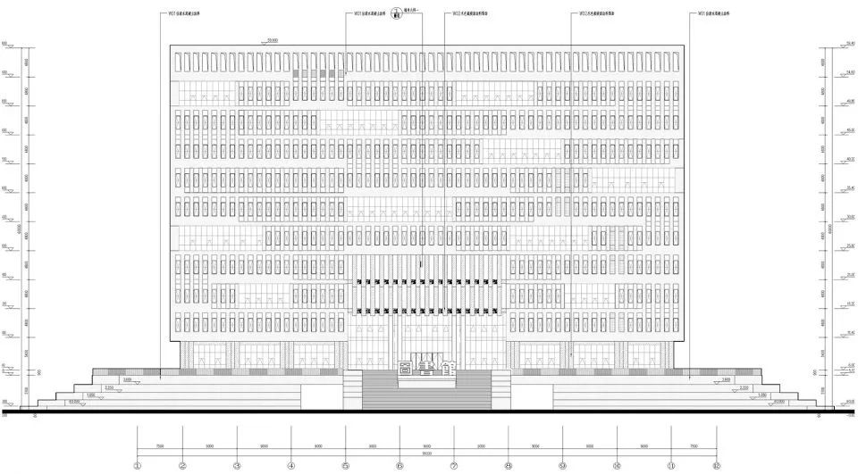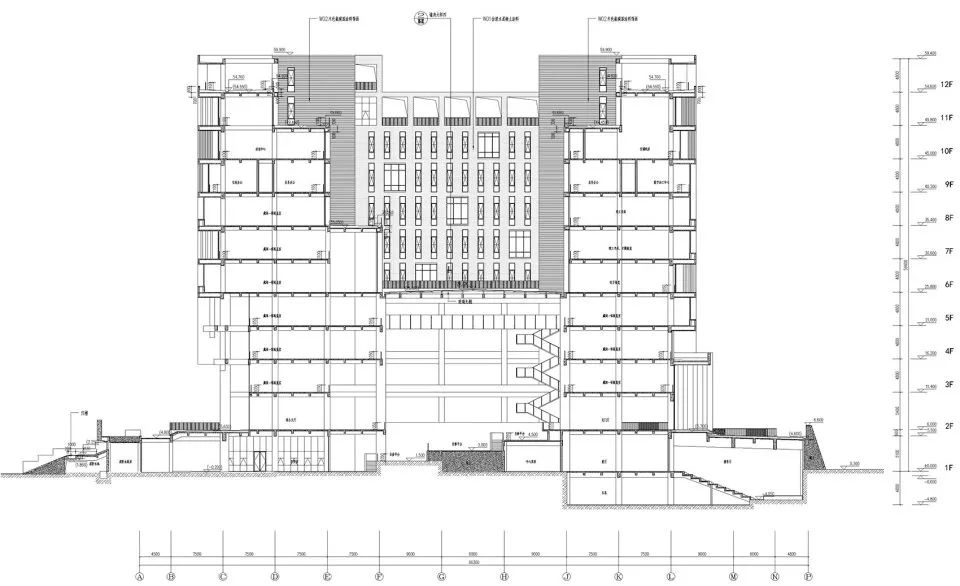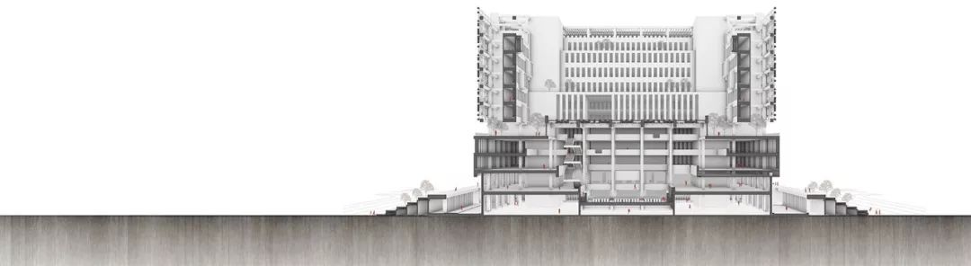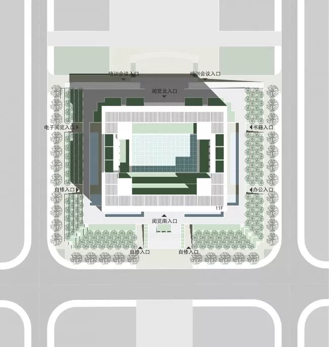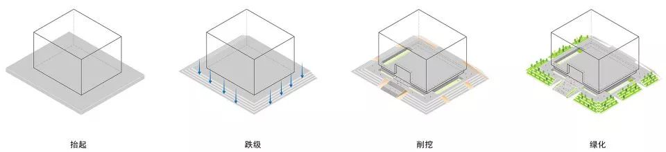 图书馆位于平坦宽阔的轴线中心,是整个校园的标志性建筑。建筑必须有足够大的体量创造具有控制力的广场界面。因此,设计将首层设计为基座—五级的跌台绿化,图书馆主体立于高台之上。