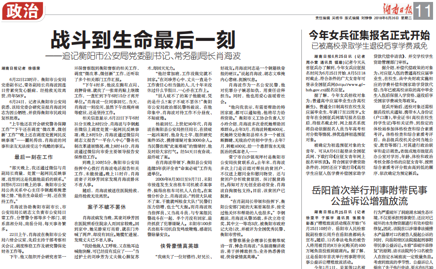 “那天晚上,我还通过微信与肖副局长商量,处置一起网民反映事项,没想到这是我跟他最后的联系。”回想6月22日晚上的事,衡阳市公安局公共关系中心主任李钢彪难掩悲恸之情,“他在生命最后一刻,还在坚持工作。”
