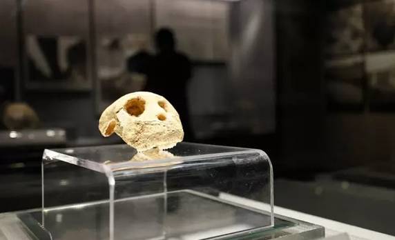 这颗化石出土于新宁县,它比人的头颅要小,但十分完整,牙齿还保留在上面,经专家鉴定,为数十万年前跟人有很近亲缘关系的猕猴头骨化石。