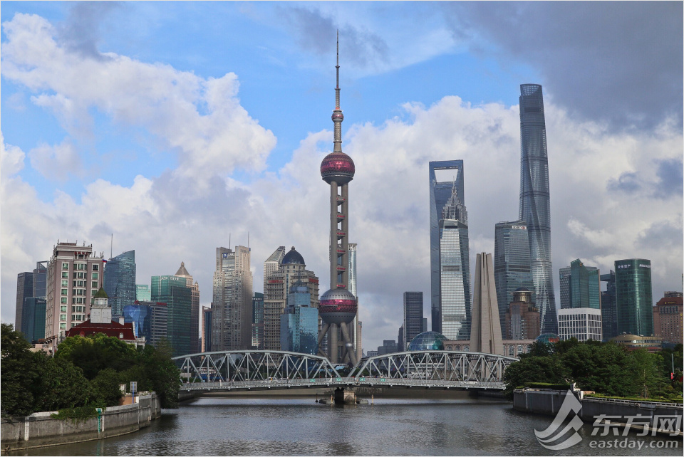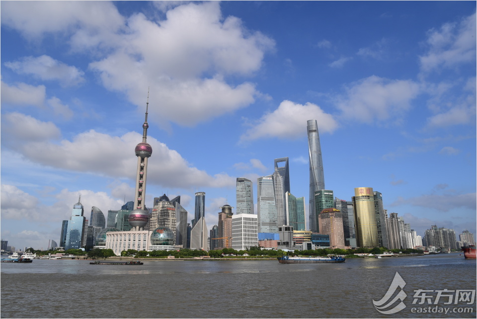 7月10日,上海天上的云层仿佛雪花牛肉般诱人,仿佛一张张“笑脸”。图为蓝天白云下的陆家嘴。