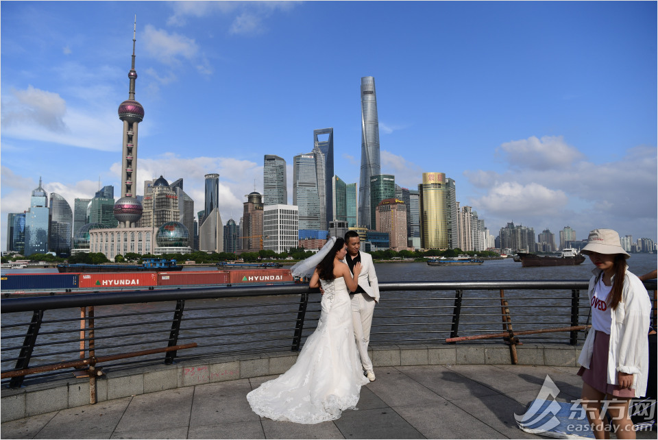 图为一对新人在外滩拍摄婚纱照。