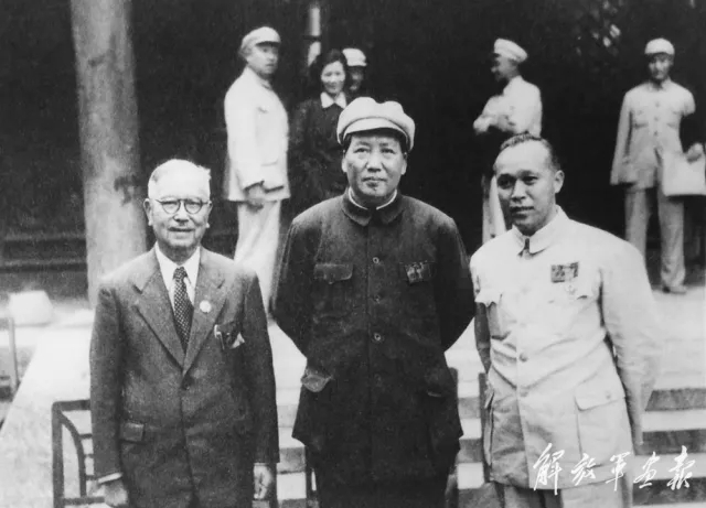 1949年6月,第一届新政治协商会议筹备会期间,毛泽东与中国侨联第一任主席陈嘉庚(左一)、副主席庄明理在中南海勤政殿前合影。