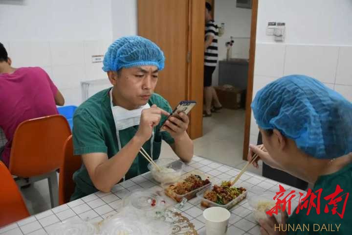 12:06 李巍结束一台手术,来到手术室餐厅吃盒饭。正吃着,手机响了,李巍接到了急诊信息。湖南日报·新湖南客户端综合报道 浏阳日报 罗娜 赖文杰 汪丹 原创