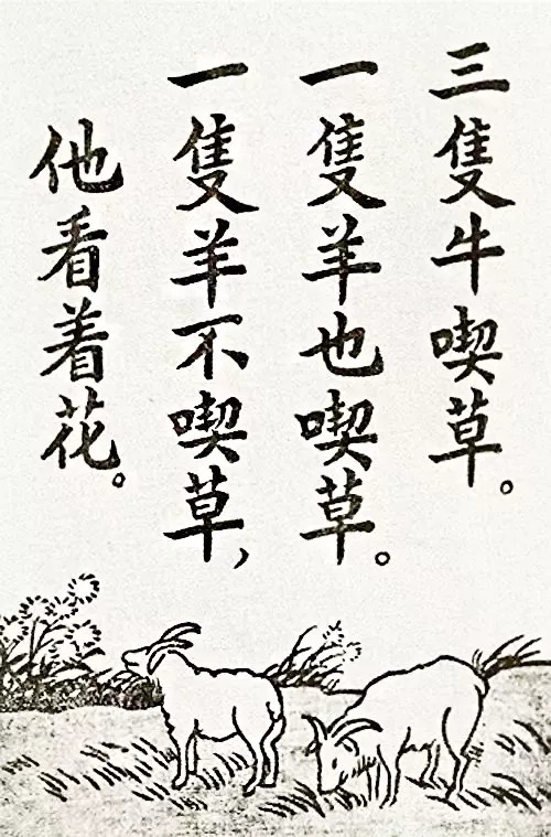 “三只牛吃草,一只羊也吃草,一只羊不吃草,他看着花。”