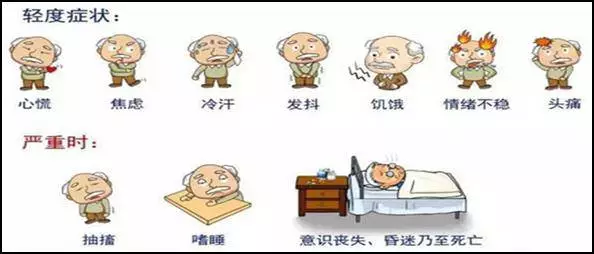 低血糖可表现为心慌、手抖、头晕、出汗、饥饿感、面色苍白、全身乏力等,严重者可表现为神志不清、抽搐、昏睡,甚至昏迷,危及生命。老年患者发生低血糖时常可表现为行为异常或其他非典型症状。有些患者屡发低血糖后,可表现为无先兆症状的低血糖昏迷,特别是病程长、胰岛功能差、血糖波动大的65岁以上老年糖尿病患者要注意预防低血糖昏迷的发生。