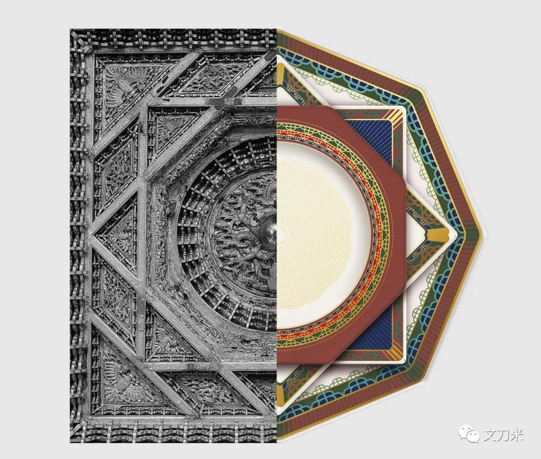 从藻井中提炼出相对简练的几何纹样,让骨粉含量为48%的高级骨瓷盘碟显得挺大气。也有一些较为年轻感的设计,在瓷杯内写有中英文对照的句子。