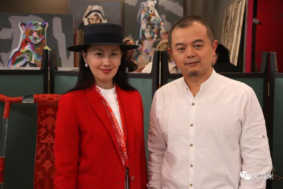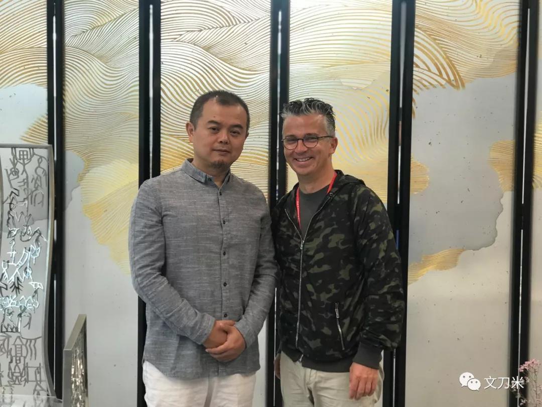 设计师Ludovic Minet与马聪在现场,背景为此次展览中深受国际买手追捧的《流金》
