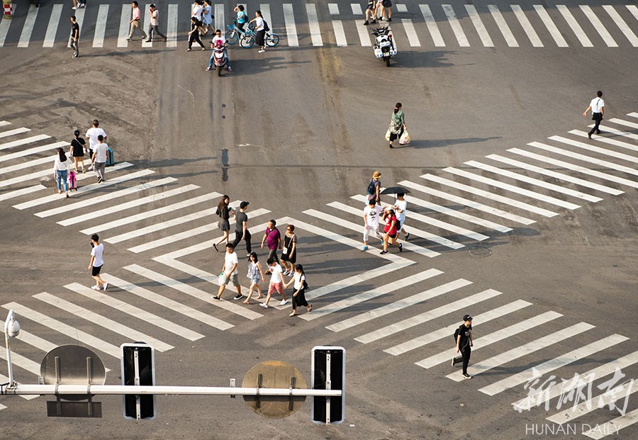 9月18日,长沙市芙蓉区解放西路与黄兴中路交叉口,行人通过对角斑马线。近期,长沙交警针对该路段人流量大的情况,设置了两条交叉的对角斑马线,方便市民斜穿马路。斜对角斑马线配有专用红绿灯,还有语音提示,保障过街市民安全。 湖南日报见习记者 傅聪 摄