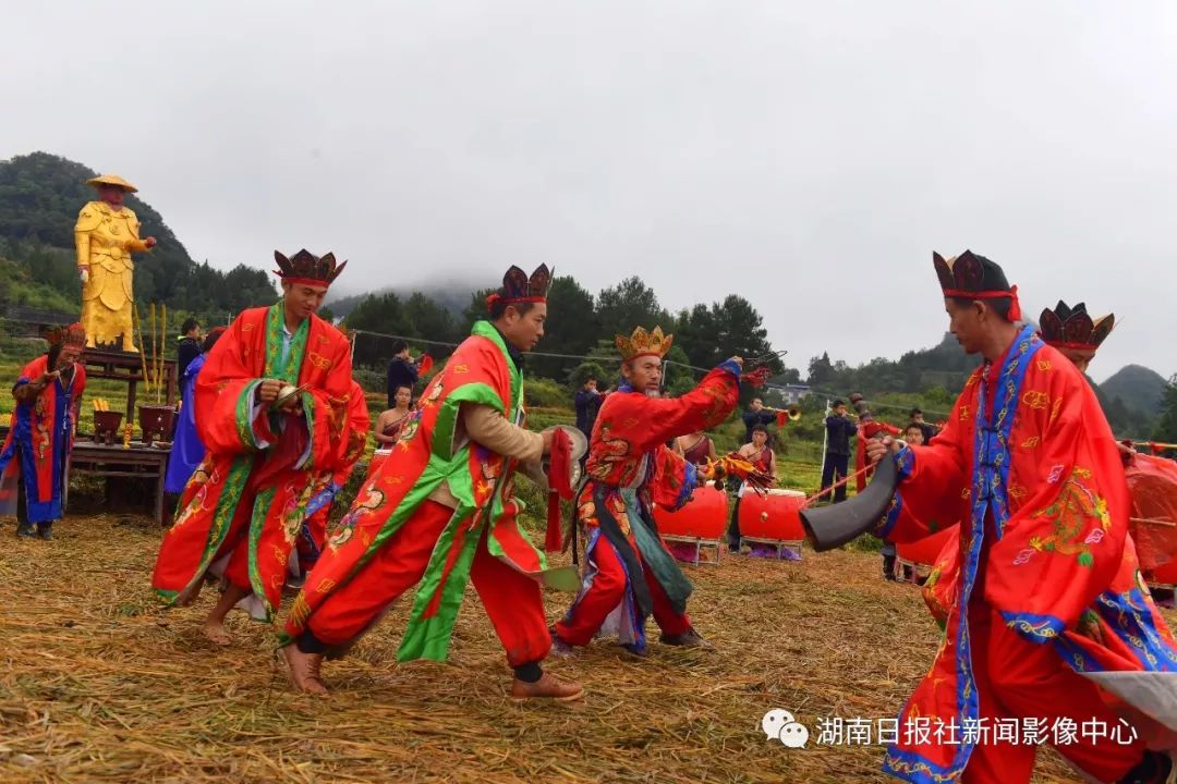 秋收季节,土家山民将田里的稻谷割倒,扎成小把,首尾相连,摆放成龙的形状,喻示着在龙的庇护下,才有风调雨顺的好年成。