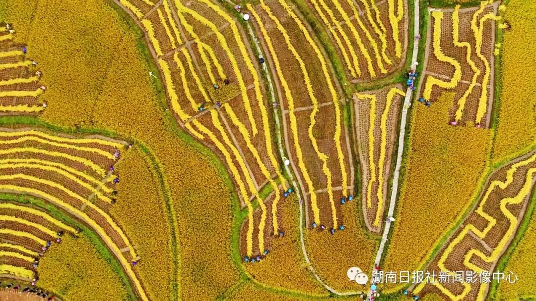 从高处俯瞰,稻谷弯弯曲曲,像是一条条金光灿烂、活灵活现的瑞龙在游动,极为壮观。