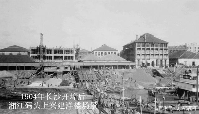 1904年长沙开埠后湘江码头上兴建洋楼场景