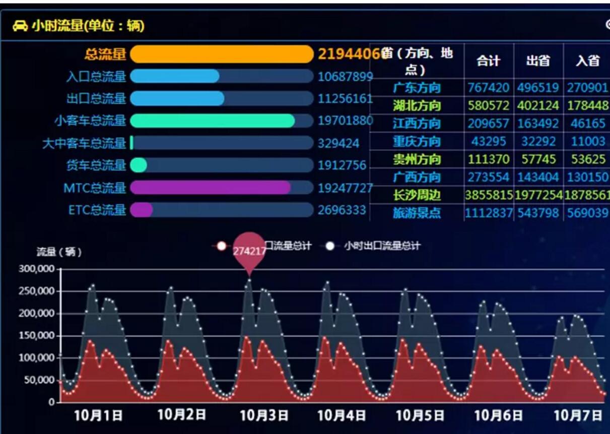 报告数据显示,2018年国庆假期7天(10月1日至7日),全省高速公路出入口总流量2,194万辆,峰值出现在10月1日,峰值流量347万辆,是平日流量的2.2倍,峰值较去年下降7.4%。