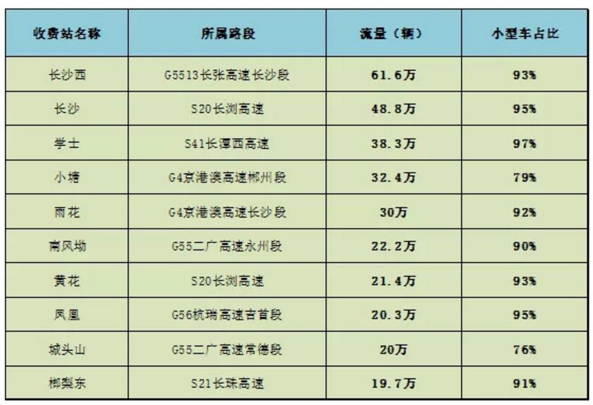 国庆期间,车流较大的收费站主要集中在环长沙周边收费站以及湘粤、湘鄂省际收费站。以长沙城东和城西两大出入口流量最为集中。其中长张高速长沙西收费站出入口总量达61.6万辆,占长沙周边收费站出入口总流量的16%;其次是长浏高速长沙收费站出入口流量达48.8万辆,占长沙周边收费站出入口总流量的13%。