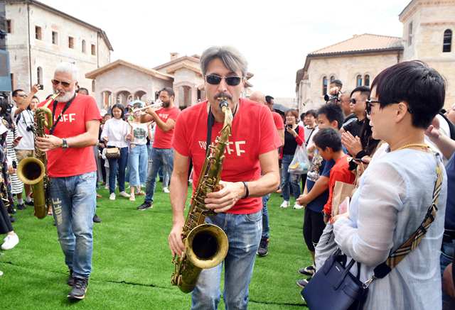 10月1日,华谊兄弟(长沙)电影小镇,来自意大利的艺术家在表演爵士乐。当天,意大利湖南音乐文化周在该镇启幕,意大利风情与湖湘文化的碰撞,为游客带来不一样的节日体验。 湖南日报记者 田超 摄