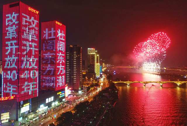 10月1日晚,长沙市橘子洲风景区燃放以《中国梦,世界情》为主题的音乐焰火。璀璨的焰火与湘江中路万达广场庆祝改革开放40周年的灯光秀交相辉映,共同庆祝新中国成立69周年。 傅聪 李健 摄影报道