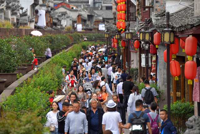 10月1日,众多游客在凤凰古城观光。当天是国庆黄金周第一天,凤凰古城游客逐渐增多。该县组织了500名志愿者提供服务,让游客有序、安全旅游乐享假期。湖南日报记者 郭立亮 通讯员 麻正规 摄影报道
