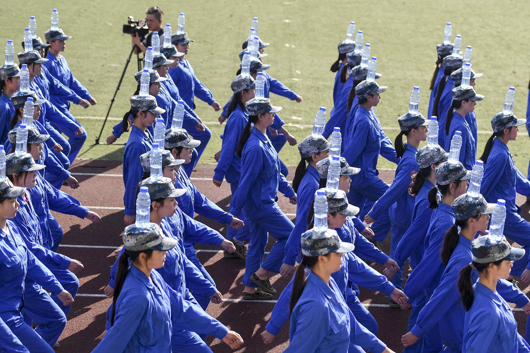 2018年9月30日,长沙某高校2018级军训总结表彰大会上,数十位女生组成的水瓶方队吸引了众人眼球。女生们头顶水瓶完成了转向、蹲下与起立、走正步等动作,稳健的步伐保证了头顶水瓶的稳定。 杨华峰(湖南分社)/中新社/视觉中国