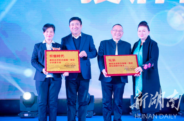 现场的颁奖环节将整个汇报招待会气氛推向顶点——为表彰两品牌在联合国上取得的不斐成绩,王志红、陈胜年亲自为坛宗颁发“湘菜走进联合国唯一指定老坛剁椒大鱼头”、为炊烟时代颁发“湘菜走进联合国唯一指定小炒黄牛肉”。