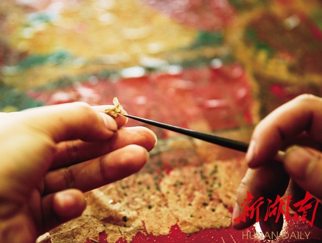 文物修复,父辈们讲究保护性修复,即“修旧如旧”,刘胄更倾向于复原性修复,即“修旧如新”。几年前,父亲在老家接了一单修复纯金匾的活,4米长的金匾,是清朝知名学者贺长龄送的,因年代久远,金粉已经模糊斑驳。刘胄当初用国外进口的材料进行修复,效果不佳。最后,父子俩发现,用传统的老手艺修复更合适,即用大漆(即国漆)沾上石灰搅拌均匀,填补脱落部分,在大漆将干未干时,沾上金粉。用传统手法不着痕迹地“修旧如新”,顾客惊叹:神奇!
