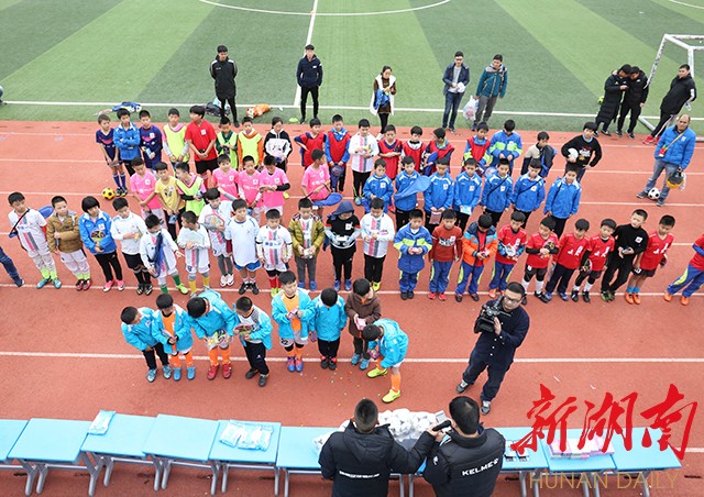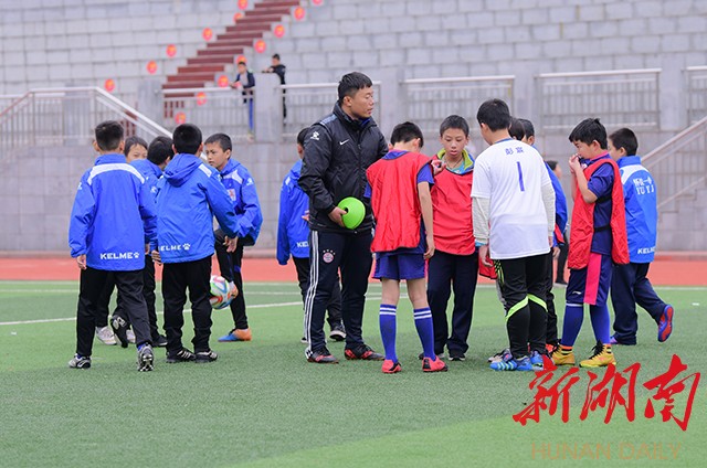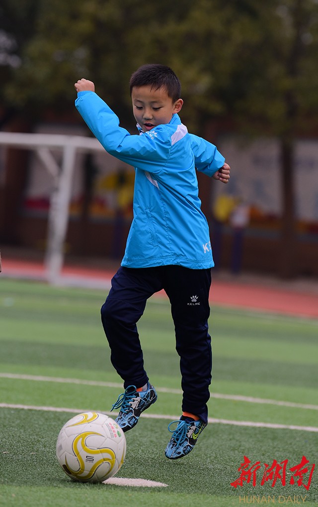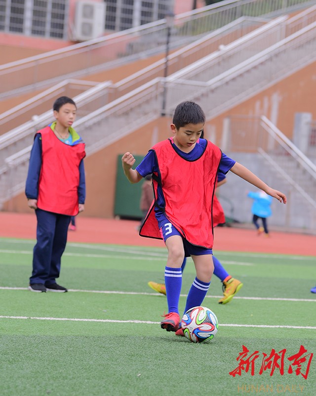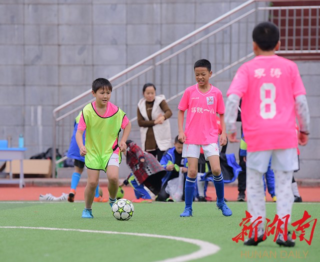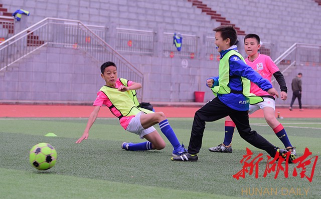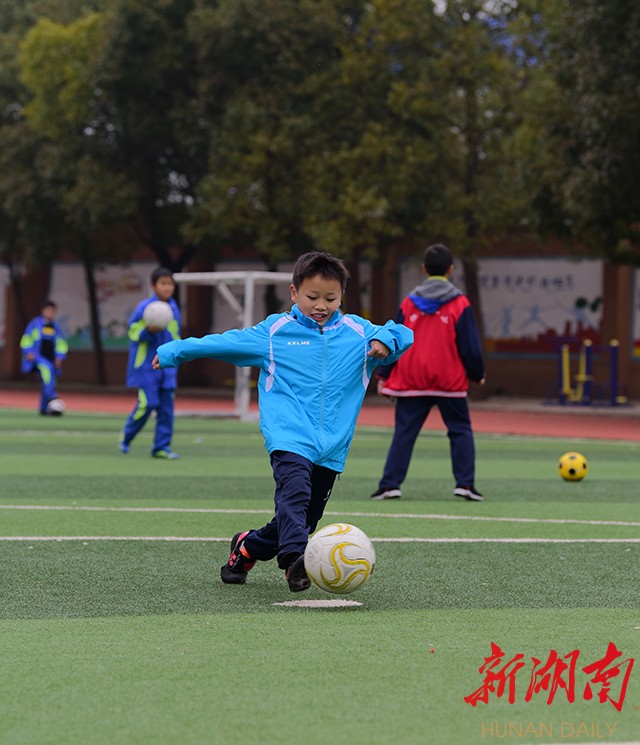 目前,怀化市拥有国家级足球特色学校59所。这些学校每周至少开展两堂足球课。同时,全市开设了市、县、校三级足球联赛,青少年足球人口达2万人以上。图为学生们在踢球。